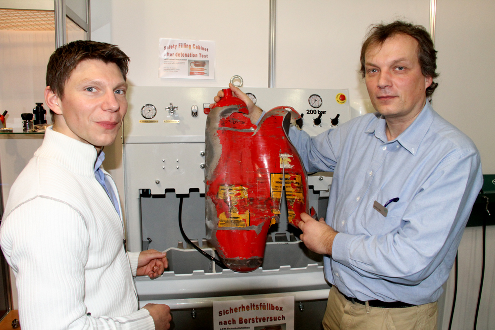 Besucher der „boot“ können sich am Stand von Leohardt & Wagner die Trümmer der zerborstenen Flasche ansehen. „Bei 330 bar gab es einen ohrenbetäubenden Knall und die 550 Kilo schwere Sicherheitsbox hob mehrere Zentimeter vom Boden ab“, berichtet Volker Holz, technischer Entwickler. Ansonsten ist alles in Ordnung. In zahlreichen Ländern sind spezielle Füllräume vorgeschrieben, da eine berstende Flasche gefährlich splittern kann. Das Unternehmen bietet als günstigere Alternative zu explosionsgeschützten Räumen eine gepanzerte Sicherheitsfüllbox an, die vor lebensgefährlichen Splittern schützt. 330 bar reichen, um eine Flasche bersten zu lassen? Um keine falsche Panik aufkommen zu lassen: „Wir haben die Flasche entsprechend präpariert und zwei Drittel der Wandstärke abgetragen, damit sie explodiert“, verrät David Apfelthaler, Marketing, „Normale Stahl- und Aluminiumflaschen vertragen einen Druck von 500 bar.“ Weitere Infos unter: www.lenhardt-wagner.de, „boot“, Halle 3, A 32