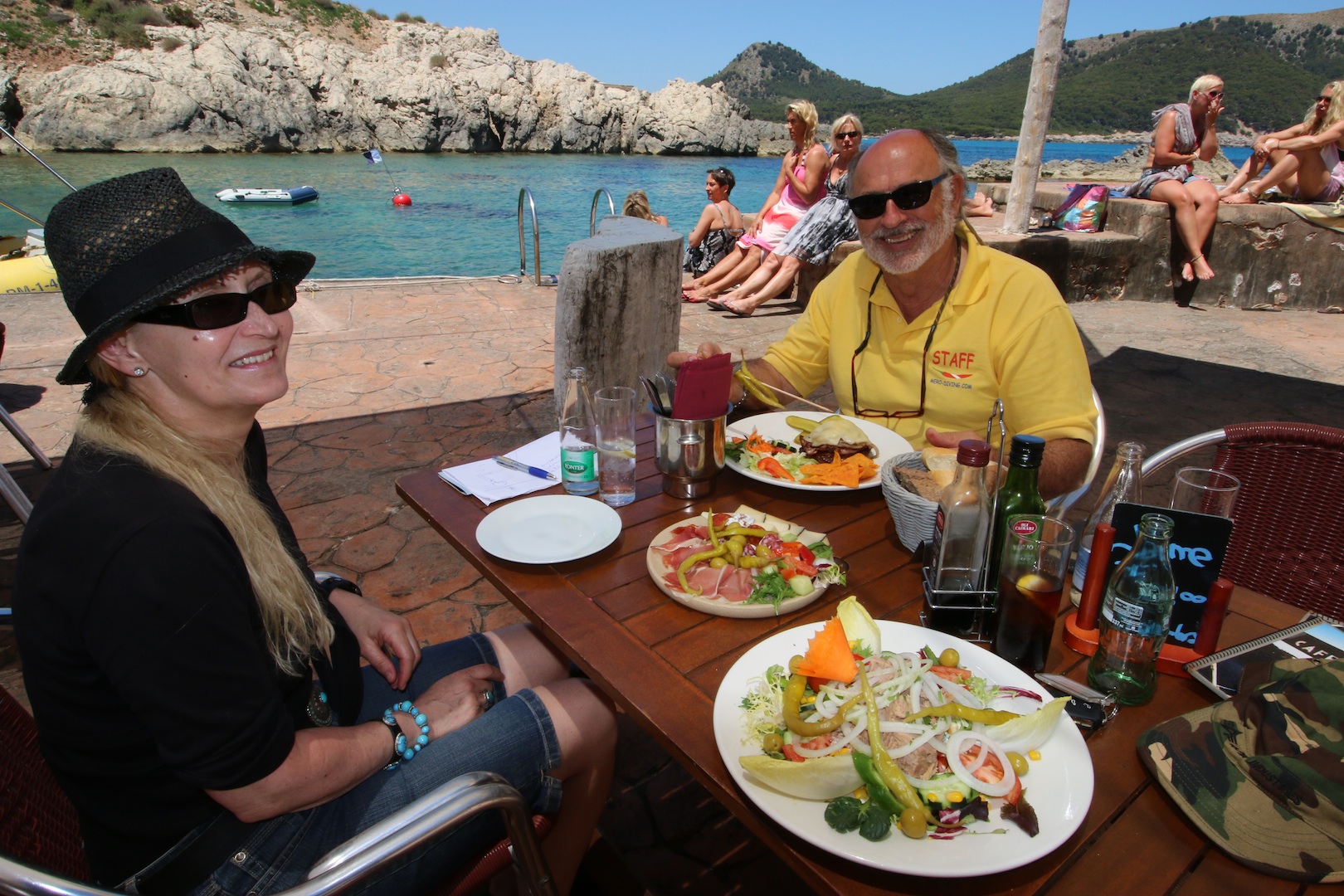 Nach dem Kurzbesuch auf Menorca geht es nun weiter zur Schwesterinsel Mallorca. Spiegelglattes Meer, 28 Grad Lufttemperatur. Nach zweistündiger Fahrt legt das Schiff in Alcudia an. Erste Station ist Mero Diving in Cala Ratjada – die älteste Tauchschule auf Mallorca. Dieses Jahr feiert die Basis das 45. Jubiläumsjahr. Und da begrüßt uns auch schon mit charmantem Lächeln „Jaime“ mit perfektem Deutsch. Seit 1982 ist er Präsident des Balearischen Tauchbasenverband PDIA (Professional Diving Instructor Association). Seine Basis liegt auf einem Plateau direkt an der Cala Lliteras – von den Locals als „Taucherbucht“ bezeichnet. Direkt daneben gibt es ein lässiges und gut besuchtes Restaurant. Wir sitzen direkt am Wasser. Die Unterhaltung mit Jaime wird ständig unterbrochen, weil sich Gäste mit ihm unterhalten wollen. Er findet für alle Zeit. „Unsere beste Werbung ist ohne Zweifel unsere Stammkundschaft“, sagt der 64-jährige Mallorquiner. Mit Tourismus ist er groß geworden. Aus dem kurzen Talk wird ein lebhaftes 3-Stunden-Gespräch: Von den Tauchmachos aus den 70er-Jahrend, die selten nüchtern unter Wasser waren. Er spricht über den Tauch-Boom in den 80ern und erzählt Anekdoten aus den 90er-Jahren. Auf-und-ab-Momente in den 2000er- und 2010er-Jahren und immer wieder von verrückten Tauchern. Natürlich ist die Entdeckung des U-Boots vor der Küste ein großes Thema (mehr dazu im Interview in TAUCHEN). Jaime taucht seit seiner Kindheit, hat über 13 000 Tauchgänge geloggt und freut sich auf den Tauchgang mit uns, als wäre es sein 30. – sensationell. Equipment anziehen – fertig! Die Boote liegen direkt am Anleger, keine fünf Meter von der Basis entfernt. Die Spots sind in wenigen Minuten angesteuert und äußerst abwechslungsreich. Canyonartige Landschaften, einige Tunnel, Torbögen und Grotten begeistern mit Lichtspielen. Bärenkrebse und Langusten verstecken sich in den Höhlen. Nach einer Stunde endet der UW-Spaß. Wir sind begeistert und müssen morgen leider wieder packen und fahren. Nächstes Ziel ist Porto Colom.