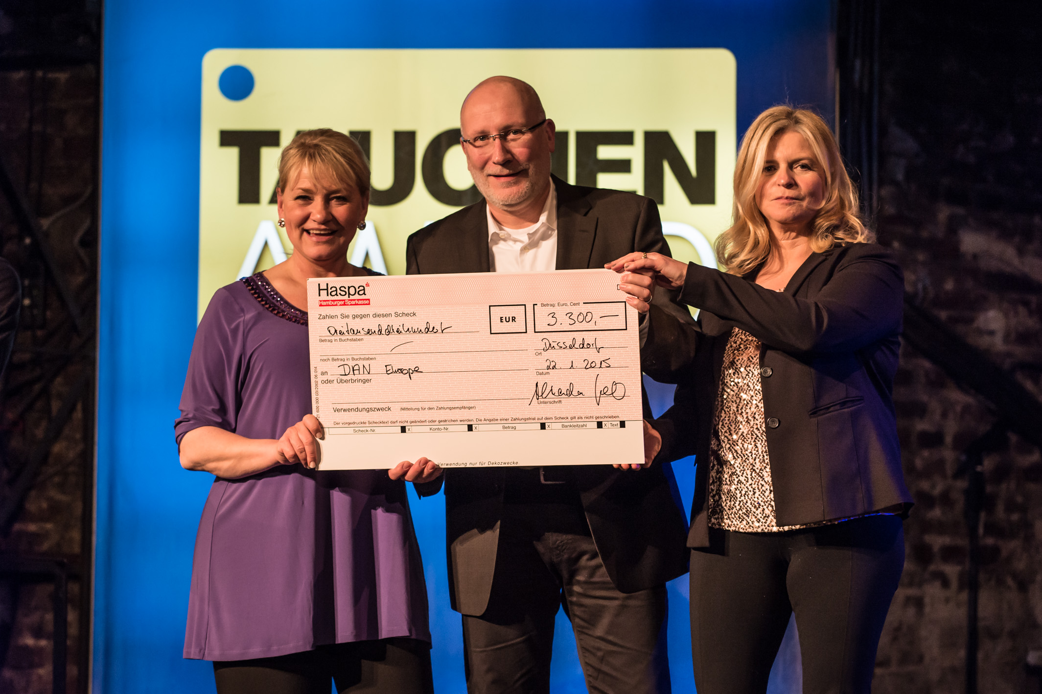 Auch eine Spende, die aus den erzielten Einnahmen der Eintrittskartenverkäufen gewonnen wurde, wurde in diesem Jahr wieder überreicht: Verlegerin Alexandra Jahr übergab Dr. Uli van Laak von DAN einen Spendenscheck in Höhe von 3300 Euro, der den Betrag stellvertretend für den Claudius Obermaier Fonds angenommen hat (/www.daneurope.org/claudius-obermaier-fund).