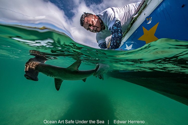 Das Foto "Hoffnung freisetzen" vom erfahrenen Fotografen Edwar Herreno, zeigt den Meeresbiologen Eduardo Espinosa, wie er ein markiertes Hammerhai-Jungtier freilässt.