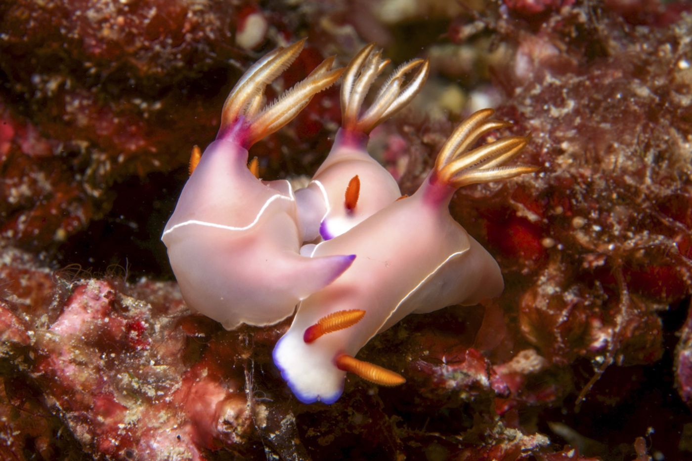 Biologisch spannend ist die Fortpflanzung dieser Zwitter: Auf der rechten Flanke tragen Nacktschnecken das Kopulations-Organ. Beim Geschlechtsakt bildet sich auf einer Körperseite ein Kanal aus, mit dem die Tiere quasi automatisch am Körper des Partners andocken. Bei der Partner-Risbecia dockt die hintere Schnecke dabei am Schwanzende des Partners vorne an. In der Tierwelt ist dieses Verhalten einzigartig.