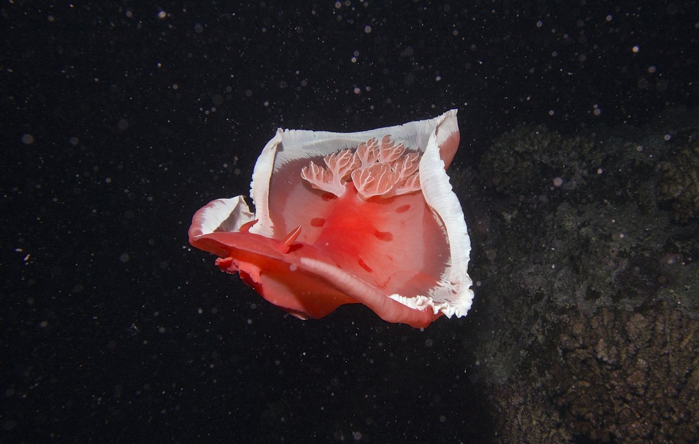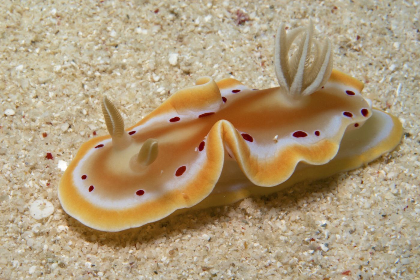 Die Nudibranchia gibt es in den verschiedensten Größen – von Winzlingen mit nur wenigen Millimetern Körpergröße bis hin zur deutlich größeren Spanischen Tänzerin, die bis zu 40 Zentimeter groß und über ein Kilogramm schwer werden kann. Dieser Gigant unter den Schnecken schwimmt durchs Riff: mit undulierenden Bewegungen seines Mantelsaums.