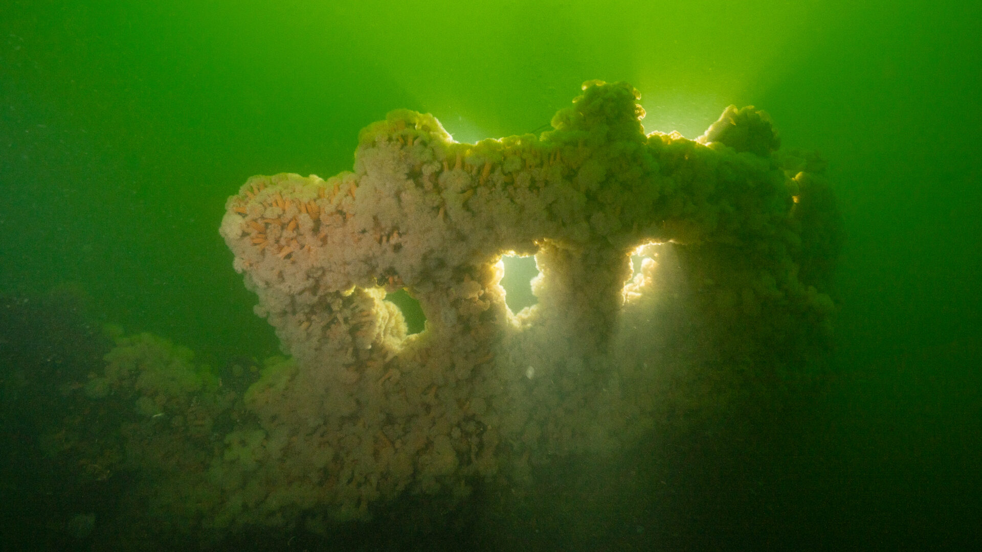 Das 100 Jahre alte Schiff ist gut erhalten. Es ist mit Seeanemonen übersät, die durch die Wasserbewegungen sanft umher schaukeln. Trotz des Bewuchses sind Decksaufbauten wie Reling und Ankerwinde noch sehr gut erkennbar. Hier und da huschen Krebse über das Deck, in einer Ladeluke entdecken wir einen immensen Dorsch. Er ist lichtscheu und versteckt sich vor unseren Tauchlampen.