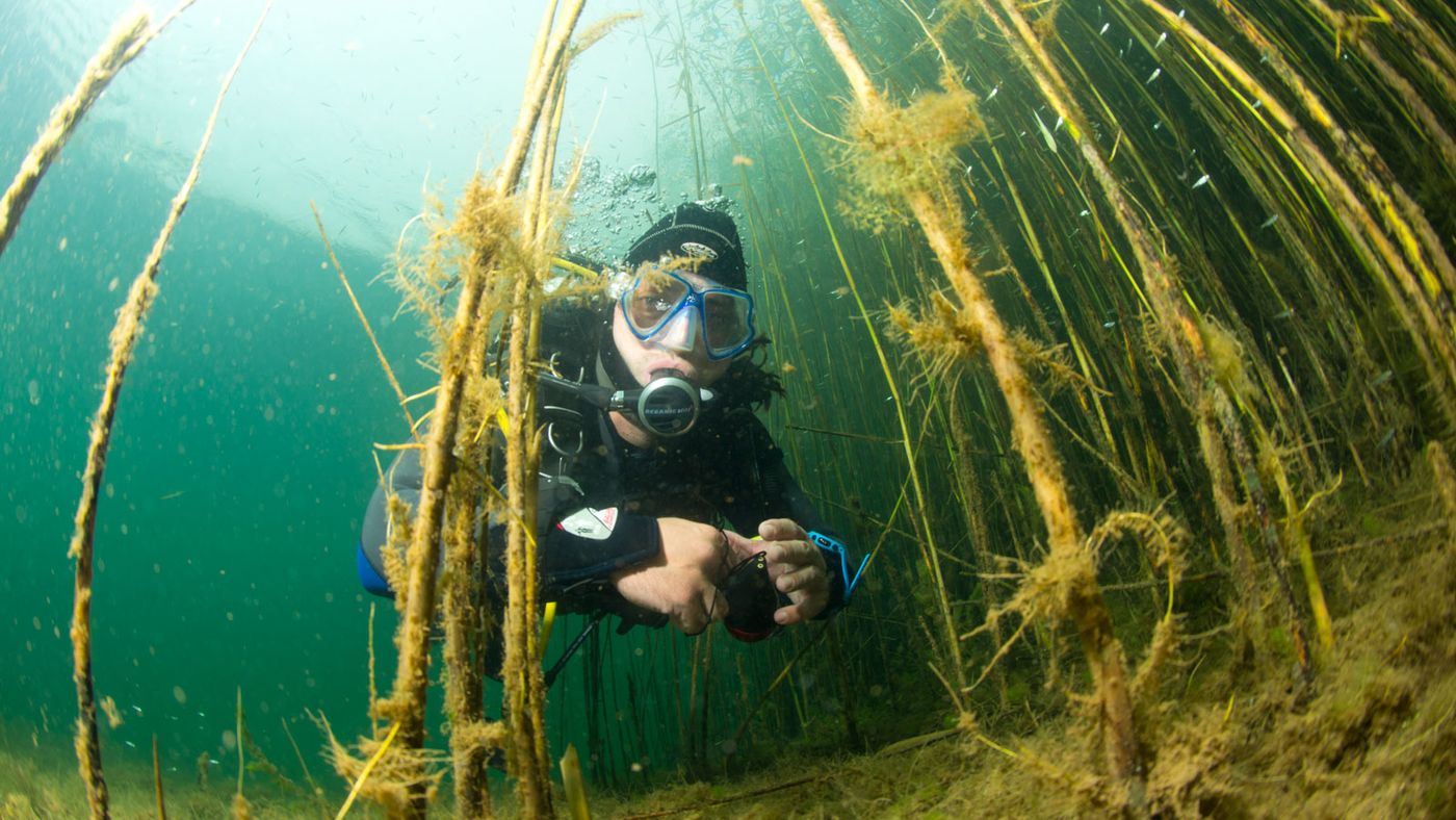 Gesagt, getan. Flossen hoch und Schneckentempo: Linker Hand, direkt neben der Einstiegsstelle der Basis, gibt es mehrere Schilffelder. Da es hier kaum tiefer als zwei Meter ist, heißt es Tarieren in Perfektion. Zur Belohnung gibt es dann Fisch satt. Schwarmweise trifft man hier auf Jungfische und kleinere Rotfedern. Schilf zur Tarnung und unerfahrene Fische als Beute – beste Voraussetzungen für Hechte, die Taucher hier erstaunlich nah an sich heran lassen. Zudem bietet der Schilfgürtel mit knapp zehn Meter, die besten Sichtverhältnisse im See. Richtung Seemitte tauchend, wird es mit zunehmender Tiefe trüber. Der Untergrund ist mal mehr, mal weniger bewachsen. Armleuchteralgen, Tausendblatt-Büsche und Wasserschlauch-Pflanzen bestimmen das Bild.