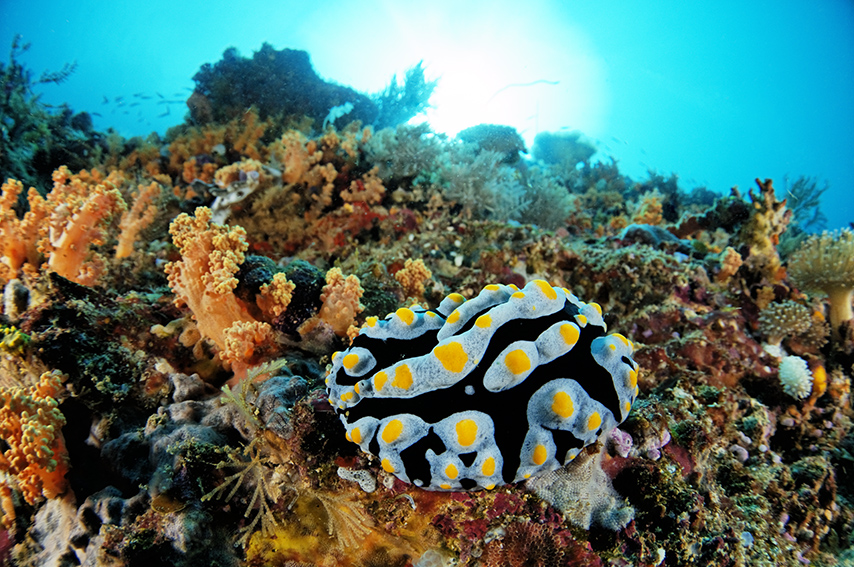 Nicht zu vergessen, diejenigen, für die das Reich der vier Könige so berühmt geworden ist: die Mantarochen. Verschiedene Arten können gesichtet werden. Der bis zu sieben Meter große Ozeanische Manta, der etwas kleinere Riffmanta – auch eine ganz spezielle Art ist hier heimisch: Der schwarze Riffmanta. Bei diesem geflügelten Riesen ist nicht nur die Oberseite der Tragflächen schwarz, sondern auch ihre Unterseite. Nur um die Kiemen herum schimmert es etwas heller. Zwischen Dezember und April wimmelt es nur so von den sanften Giganten. Bereits vom Boot aus kann man die spitzen Flügel auf die Wasseroberfläche klatschen sehen. An einigen Orten kommen die Rochen für ihre Lieblingsmahlzeit Plankton vorbei, an anderen geht es durch die Waschstraße. Bei Letzterer übernehmen die fleißigen Putzerfische die Körperhygiene, während die Riesen in der Strömung stehen als wäre es ein gemächlicher Sonntagsspaziergang. Der Artenreichtum Raja Ampats ist derart vielseitig, dass vor einigen Jahren ein Rekord aufgestellt wurde. Ein Meeresbiologe konnte in nur einem einzigen Tauchgang 283 verschieden Fischarten ausfindig machen. Das sucht seinesgleichen.