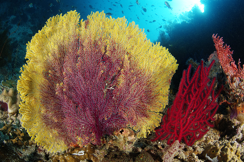 An manchen Tagen ziehen die Strömungen aber wie ein frischer Ostseewind durch die Kanäle zwischen den Inseln und um die Riffkanten herum. Auch Tiefenströmungen gibt es, die das nährstoffreiche Wasser an die Oberfläche transportieren. Daher sollte man schon ein wenig Erfahrung mitbringen, um die Gewässer des Nationalparks betauchen zu können. Was die Region außerdem auszeichnet ist ihre Korallenvielfalt. An manch einem Tauchplatz bekommt das Wort Korallengarten eine völlig neue Bedeutung. Hunderte verschiedener Arten tummeln sich in unmittelbarer Nähe, als ob ein Gärtner penibel darauf geachtet hätte, dass nicht zu viel Platz von derselben Art eingenommen wird, sondern die einzelnen Schönlinge immer abwechselnd eingepflanzt werden.