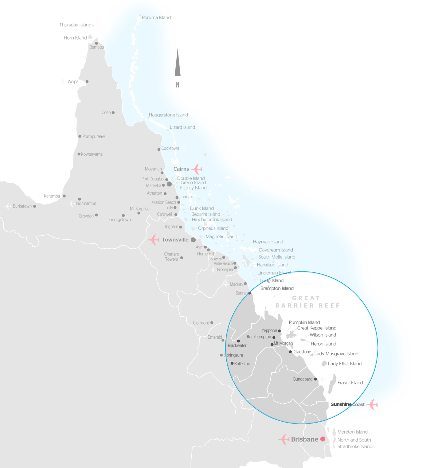 Mit dem Great Keppel Island Hideaway (3 Sterne) bietet die Insel ein einfaches, aber gemütliches Resort mit 36 Zimmern. Wer nicht über Nacht bleibt, kann auch als Tagesbesucher kommen. Die Insel liegt etwa 15 Kilometer vor der Capricorn Coast und ist mit dem Boot in 30 Minuten ab Rosslyn Bay zu erreichen. Der Abstecher ab Rockhampton ans Meer lohnt sich allein schon wegen der tollen Küstenstraße zwischen dem Ablegehafen und dem 10 Kilometer weiter nördlich gelegenen Badeort Yeppoon.