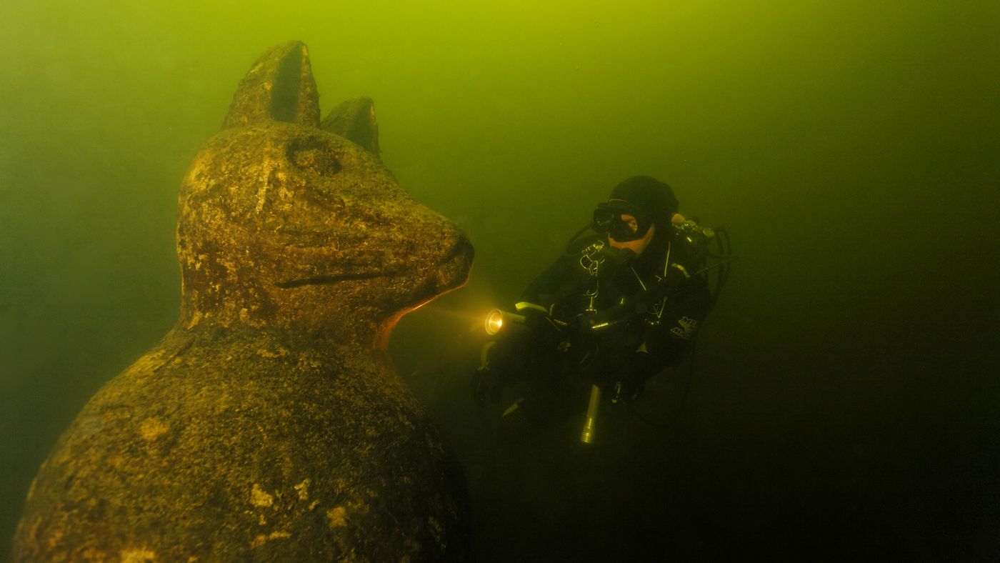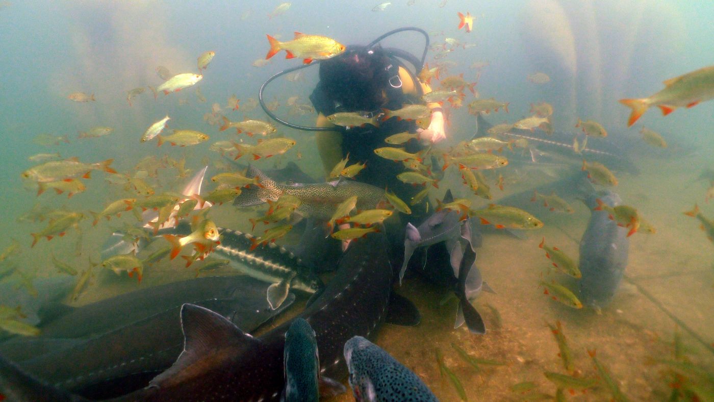 Je nach Sonneneinstrahlung entstehen darin wunderschöne Lichtspiele. Mystisch werden der auf fünf Meter Tiefe liegende Tempel und das Tal mit den riesigen Ägyptischen Katzenskulpturen beleuchtet. Ein versunkenes Wrack bietet die Herberge für Jungfische. Seitliche Gänge führen in Höhlen, die allerdings für Anfänger nur bedingt geeignet sind. Langsam schwebend hat man genügend Zeit, all die Fischschwärme zu beobachten. Und plötzlich zeigen sich die Stars des Teichs, die Störe! Die Riesenfische haben ein harmloses Saugmaul und scheuen sich nicht vor den blasenblubbernden Kreaturen aus der „Oberwelt“. Doch auch hier gilt das oberste Gebot der Taucherwelt: Angucken ja, anfassen nein.