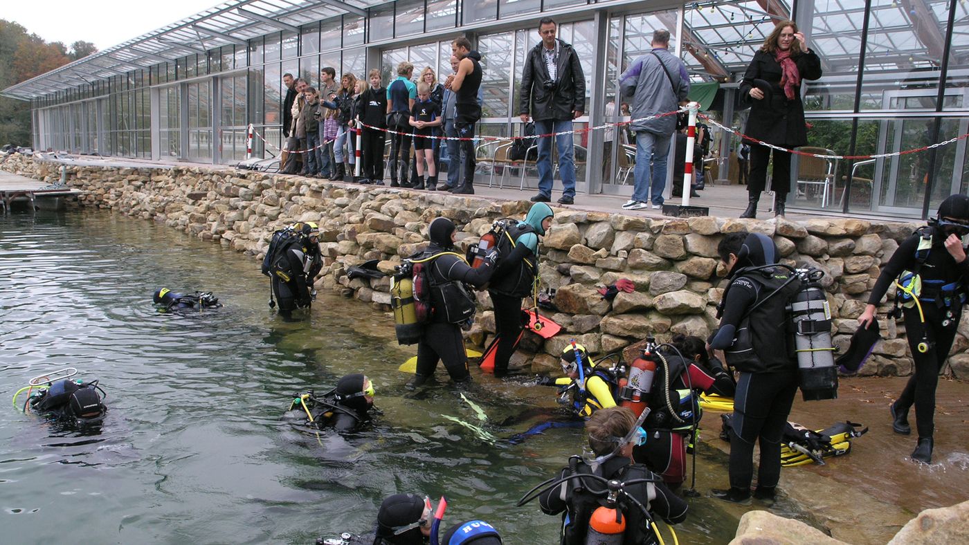 Vor den geöffneten Pforten wartet auch Michaela darauf, ihren Geschenkgutschein fürs Schnuppertauchen einzulösen. Sie ist, das merkt Steve ihr an, ein bisschen aufgeregt. Immerhin soll es für sie bis in eine Wassertiefe von etwa sieben Metern gehen. Im neuen Übungsbecken mit geschultem Personal kann sie ihre ersten Erfahrungen in der Unterwasserwelt machen. Erst dann geht es mit dem Tauchlehrer in den Unterwasserpark in den gigantischen, seerosenbestandenen Folienteich.
