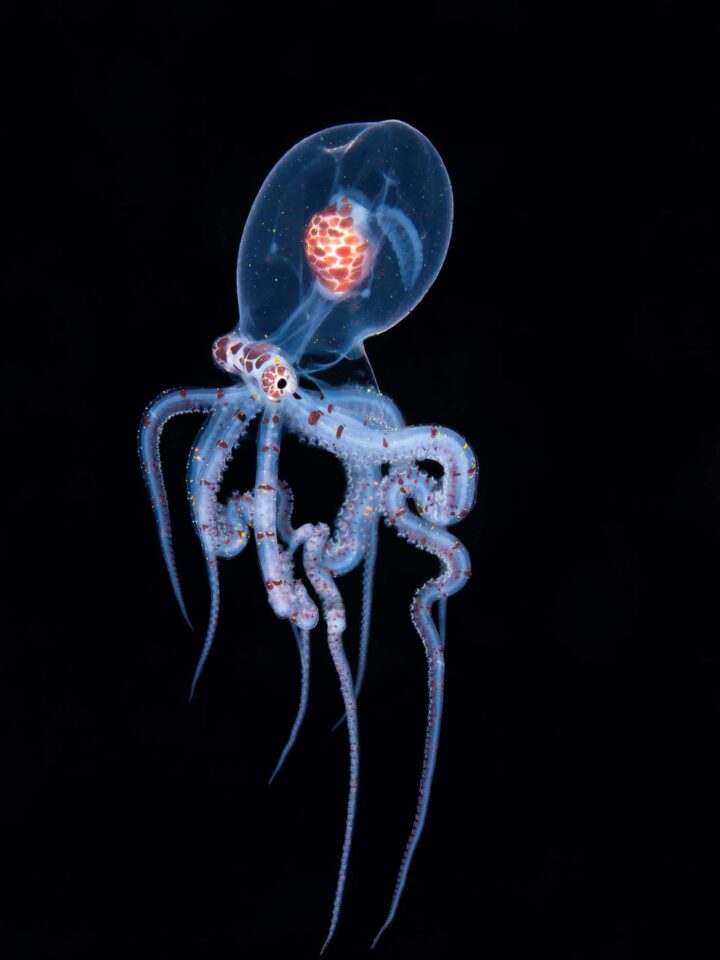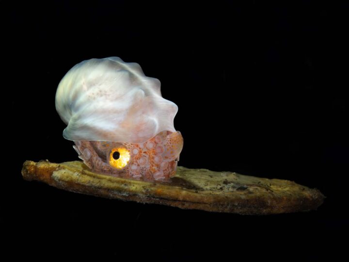 Ein letzter Blackwater-Tauchgang. Zwischen Dunkelheit und Licht erleben wir eine Szenerie, die an ferne Galaxien erinnert. Eine kleine Qualle hier, eine Schwimmkrabbe da. Dann ein juveniler Mimik-Oktopus, durchsichtig und fremdartig wie ein Alien. Kurz vor Ende stiehlt ein Papier-Nautilus die Show, der per Anhalter auf einem Blatt durch die maritime Galaxis reist.