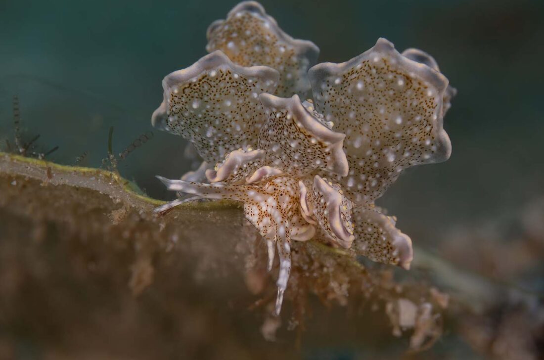 Unser Tauchguide Rosebe verspricht uns gleich zwei Highlights: eine Melibe Colemani – der Heilige Gral unter den Nacktschnecken – und mit etwas Glück einige der Schmetterlings-Nacktschnecken. Schon wenige Minuten später gleiten Cyerce Elegans, Cyerce Nigra und Cyerce Bourbonica elegant über den Laufsteg der schönsten Nacktschnecken.