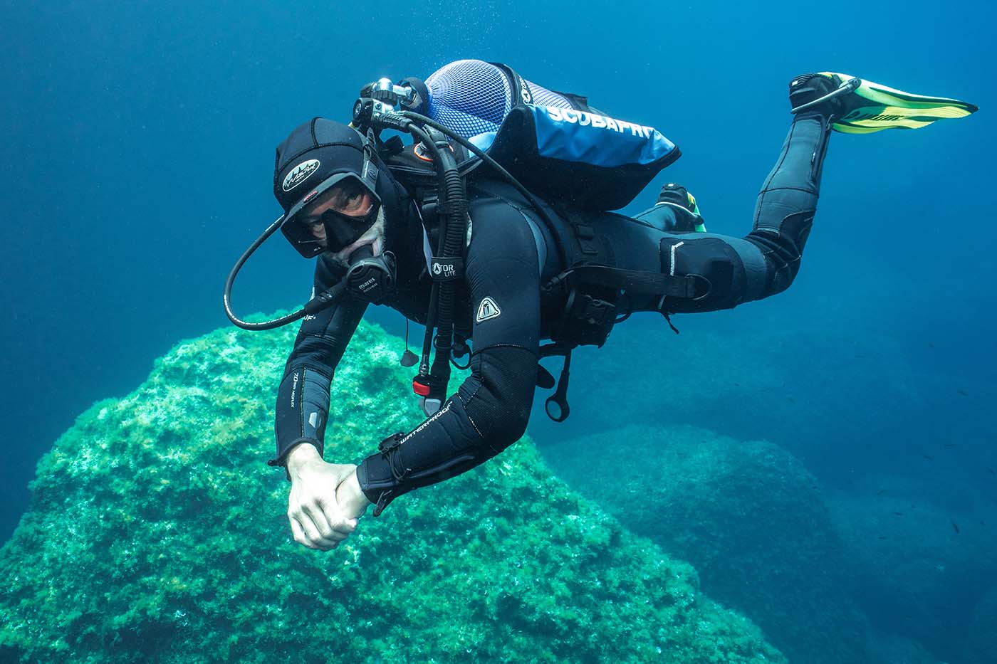 Bevor es auf Reisen ging, habe ich zwei Tauchgänge in Deutschland unternommen, um mich mit dem neuen Westen-Modell vertraut zu machen. Der erste Eindruck war positiv: sauber verarbeitet, angenehm leicht, klar strukturiert. Mit seiner Zuladung von fünf Kilogramm Blei konnte ich mit dünnem Unterzieher und Trilaminat-Trockentauchanzug sowie 12-Liter-Flasche allerdings gerade so abtauchen. Der Sicherheitsstopp mit fast leerer Flasche war ein »strampelndes unten bleiben« mit viel Ausatmen und wenig Einatmen. Für dickere Unterzieher fehlt dem Navigator Lite klar etwas Bleikapazität. Natürlich kann man auf einen Bleigurt zurückgreifen. Auf der Insel Gozo warteten dann zehn Tauchgänge im Sieben-Millimeter-Halbtrockenanzug auf das ultraleichte Reisejacket, viele davon jenseits der 30-Meter-Tiefenmarke. Ein Härtetest unter realen Bedingungen, dem das neue Reisewing von Scubapro nominell gewachsen sein soll.