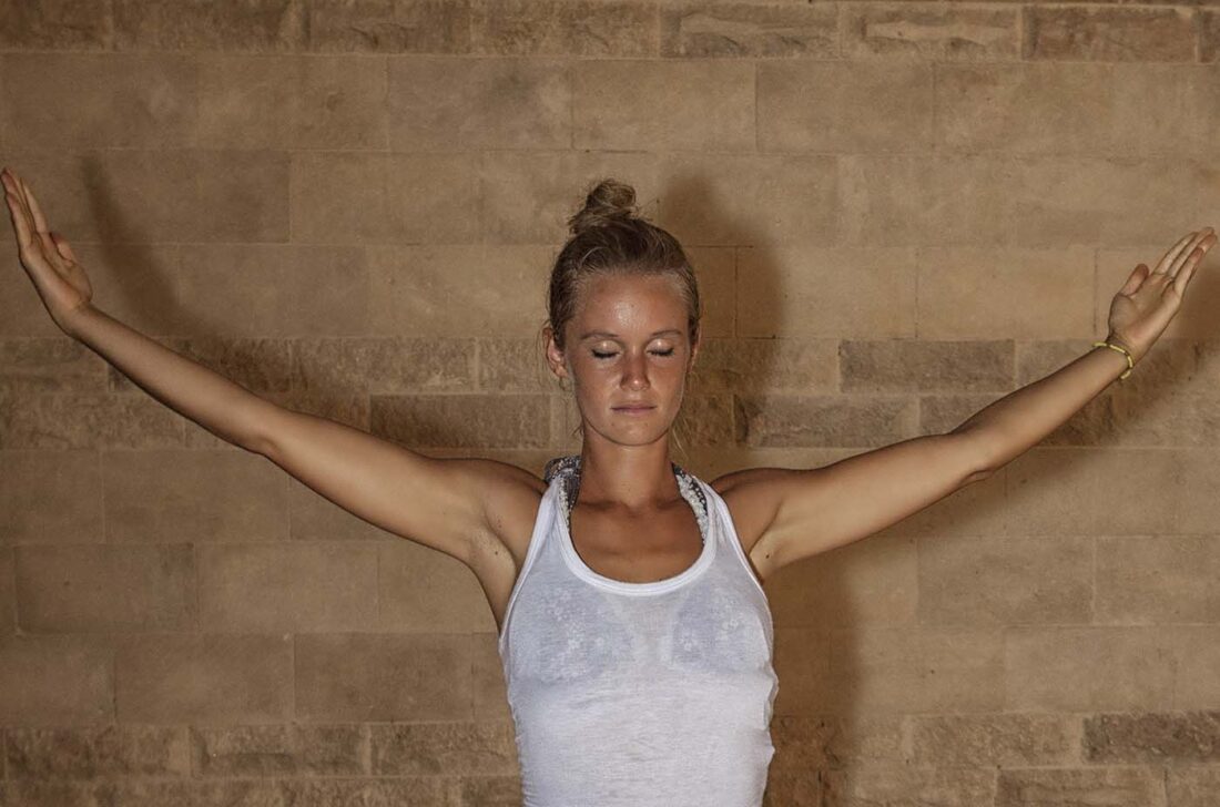 Voll eingeatmet führen Sie die Hände über dem Kopf zueinander, wobei die Finger ineinander greifen. Drehen Sie die Hände einmal, sodass die Handflächen zur Decke zeigen. Voll eingeatmet halten Sie den Atem an und stretchen sich einmal nach links und einmal nach rechts. Anschließend atmen Sie doppelt so langsam aus, wie Sie eingeatmet haben. Die Hände sinken dabei nach unten und kommen in die Ausgangsposition unterhalb des Nabels wieder zusammen.